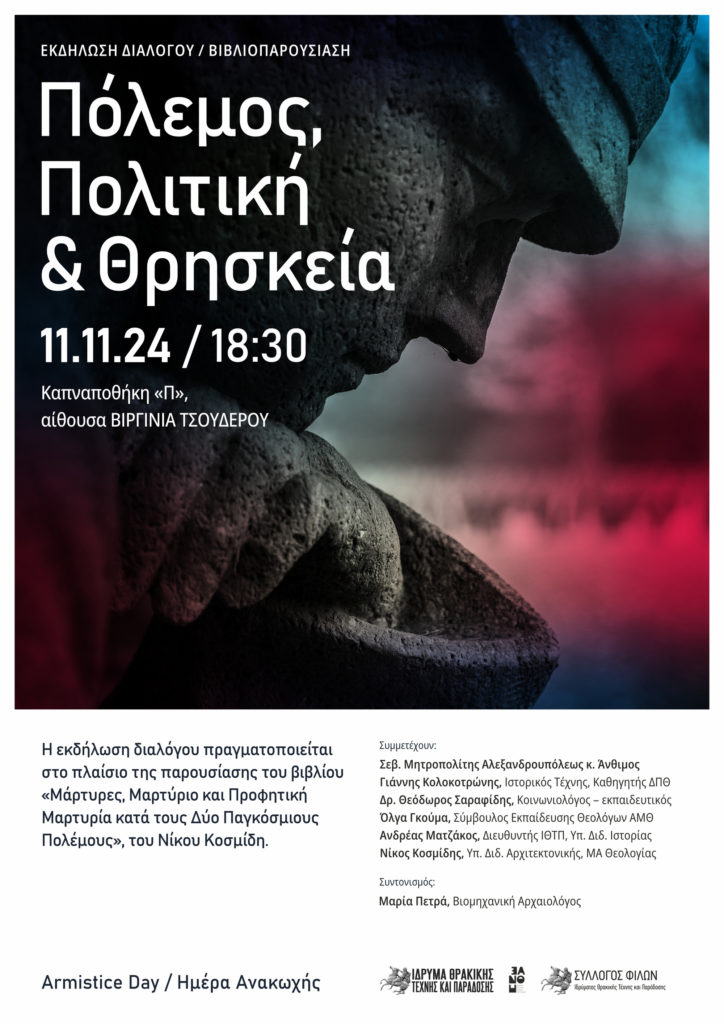 Εκδήλωση διαλόγου και βιβλιοπαρουσίαση διοργανώνεται τη Δευτέρα, 11 Νοεμβρίου 2024, στις 18:30, ανήμερα της Ημέρας Ανακωχής (Armistice Day), από το Ίδρυμα Θρακικής Τέχνης και Παράδοσης, το πρόγραμμα Δράσεις Ιστορίας Μνήμης Πολιτισμού και τον Σύλλογο Φίλων του ΙΘΤΠ.