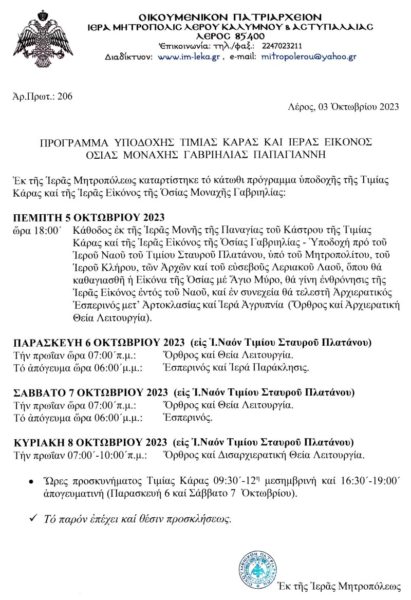Σειρά από λατρευτικές εκδηλώσεις θα λάβουν χώρα στο νησί της Λέρου από αύριο, Πέμπτη 5 Οκτωβρίου, έως και την ερχόμενη Κυριακή 8 Οκτωβρίου.