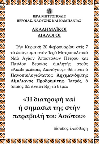Το θέμα: «Η διατροφή και η σημασία της στην παραβολή του Ασώτου» θα αναπτύξει ο Πανοσιολογιώτατος Αρχιμανδρίτης Αιμιλιανός Προδρομίτης, Ιατρός, στους «Ακαδημαικούς Διαλόγους», την Κυριακή 20 Φεβρουαρίου στις 7 το απόγευμα στον Ιερό Μητροπολιτικό Ναό Αγίων Αποστόλων Πέτρου και Παύλου Βεροίας.