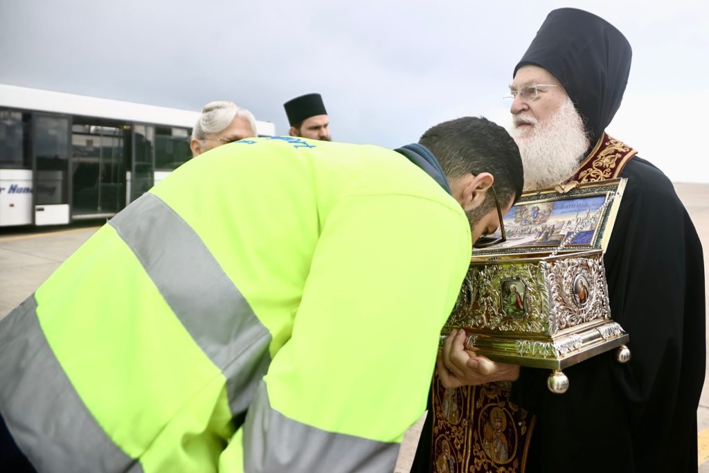 Πλήθος κόσμου στο αεροδρόμιο έσπευσε να προσκυνήσει το Θεομητορικό κειμήλιο, το οποίο στη συνέχεια αναχώρησε με προορισμό την Ιερά Μεγίστη Μονή Βατοπαιδίου Αγίου Όρους, όπου αποθησαυρίζεται, συνοδευόμενο από τον Καθηγούμενο της Μονής Γέροντα Εφραίμ.