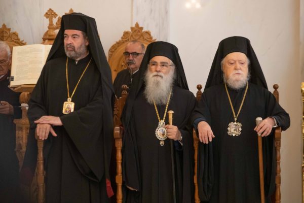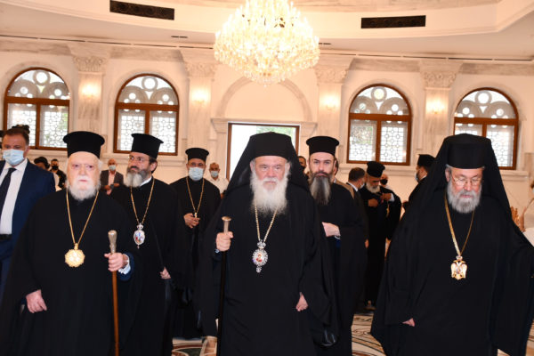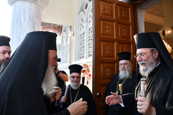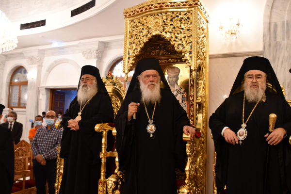 Του πολυαρχιερατικού συλλειτούργου προεξήρχαν οι Μακαριώτατοι Αρχιεπίσκοποι Αθηνών κ.κ. Ιερώνυμος και Κύπρου κ.κ. Χρυσόστομος, συλλειτουργούντων τού Μητροπολ. Βρυούλων κ. Παντελεήμονος ως εκπροσώπου τού Παναγιωτάτου Οικουμενικού Πατριάρχου κ.κ. Βαρθολομαίου, του Μητροπ. Δωδώνης κ. Χρυσοστόμου, των Μητροπολιτών τής Εκκλησίας Κύπρου, Πάφου κ. Γεωργίου, Κιτίου κ. Νεκταρίου, Κυρηνείας κ. Χρυσοστόμου και Τριμυθούντος κ. Βαρνάβα, των Επισκόπων Νεαπόλεως κ. Πορφυρίου και Μεσαορίας κ. Γρηγορίου, και κληρικών τής Εκκλησίας Ελλάδος και Κύπρου. Συμπροσευχόμενοι παρέστησαν επίσης οι Μητροπολίτες Κορωνείας κ. Παντελεήμων και Βόστρων κ. Τιμόθεος καθώς και οι Θεοφιλέστατοι Επίσκοποι Καρπασίας κ. Χριστοφόρος, Αρσινόης κ. Παγκράτιος, Χύτρων κ. Λεόντιος και Νιτρίας κ. Νικόδημος.