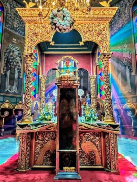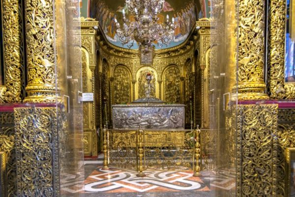Η λάρνακα συνήθως είναι κλειστή όμως κατά τους καλοκαιρινούς μήνες και ανάλογα με την προσέλευση του κόσμου την ανοίγουν. Η εκκλησία δεσπόζει στο λιμάνι και το πυργοειδές καμπαναριό θυμίζει αυτό του Αγίου Μάρκου στη Βενετία. Το ύψος του ξεπερνά τα 40 μέτρα, αποτελεί το σήμα κατατεθέν της πόλης και πολλές φορές το φωτίζουν.