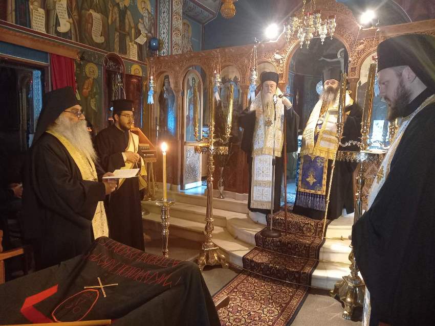 Στον επικήδειο λόγο του ο Σεβασμιώτατος περιέγραψε την ζωή με τρεις λέξεις, ως σταθμούς: ήμαρτον, συγχωρέστε με και φεύγω. Μετά το Προπατορικό αμάρτημα δεν μπορεί να γεννηθεί κανένας άνθρωπος αναμάρτητος, καθώς όλοι φέρουμε την πεπτωκυία φύση. Το Προπατορικό αμάρτημα συνοδεύεται από «ταοψώνιατής αμαρτίας», που φέρουν τον θάνατο. Έστω και μια ώρα ή ένα λεπτόνα ζήσει ο άνθρωπος είναι αμαρτωλός και αυτό γιατί η ζωή του έχει εκτραπεί από το θέλημα του Θεού, αφού μαζί με τον πρωτόπλαστοπαρεκτράπει ολόκληρο το ανθρώπινο γένος οδηγούμενο προς τον θάνατο. Γι᾿ αυτόν τον λόγο ο Θεός μας προετοίμασε για τον ερχομό του Υιού Του στην γη,ώστε να σωθούμε. Ο Χριστός κατέρχεται για να αποκαταστήσει τα πράγματα, ζητά την μετάνοια, δηλαδή την αλλαγή της νοοτροπίας μας και τον από-χωρισμό μας από τα έργα της αμαρτίας. Η μετάνοια προϋποθέτει την αυτογνωσία και η συγχώρηση είναι πρώτα από τον Θεό και έπειτα από τους ανθρώπους που συζήσαμε, καθώς οι συνάνθρωποί μας είναι εικόνες του Θεού. Το φεύγω σημαίνει ότι επιστρέφω από εκεί που προήλθα. Η μακαριστή αδελφή Ευβούλη θέλησε να ζήσει κάνοντας όλα τα παραπάνω πράξη και επιθυμώντας να επανεύρει τον παλαιό άνθρωπο και να μιμηθεί τα Αγγελικά Τάγματα που ατρέπτως διακονούν και δοξολογούν τον Θεό. Ολοκληρώνοντας, προέτρεψε την Ι. Αδελφότητα να προσευχηθεί για την ψυχή της αοιδίμου, ώστε να καταστεί βεβαία ότι την συγχωρήσατε και ακόμα ότι την προπέμπετε στα ουράνια σκηνώματα για να αναπαυθεί!