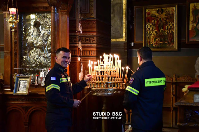 Το πρωί τελέσθηκε αρχιερατική θεία λειτουργία μετά αρτοκλασίας στον Μητροπολιτικό ναό του Αγίου Γεωργίου, χοροστατούντος του Μητροπολίτη Αργολίδος Νεκταρίου. Το παρών έδωσαν ο διευθυντής της Πυροσβεστικής υπηρεσίας Ναυπλίου πύραρχος Βασίλειος Αλεξόπουλος, αξιωματικοί και πυροσβέστες της Π.Υ Ναυπλίου καθώς και συνταξιούχοι του σώματος.