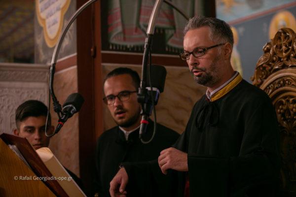 Τους ύμνους απέδωσαν αριστουργηματικά οι ιεροψάλτες του Ιερού Ναού με τις χορωδίες τους. Στο δεξιό αναλόγιο ο Πρωτοψάλτης κ. Αλέξανδρος Δασκαλάκης , ενώ στο αριστερό ο ιεροψάλτης κ. Νικόλαος Χατζής