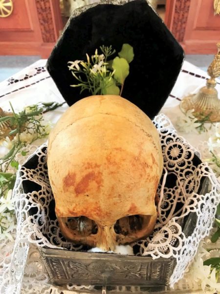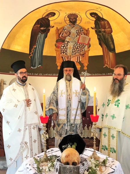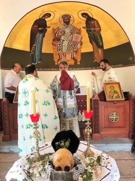 Οι συμμετέχοντες στη Θεία Λειτουργία, κλήρος και λαός, προσκύνησαν την Τιμία Κάρα της Οσίας.