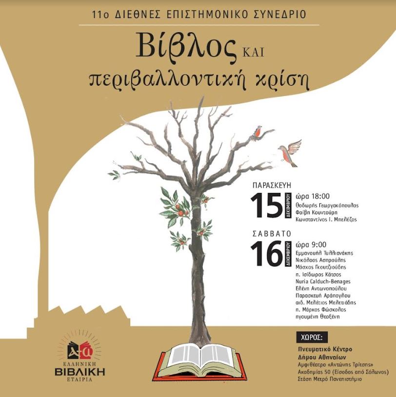 Η Ελληνική Βιβλική Εταιρία, συνεχίζοντας τη σειρά των επιστημονικών συνεδρίων που σκοπό έχουν την κριτική θεώρηση σύγχρονων ζητημάτων σε διάλογο με τη Βίβλο, διοργανώνει το 11ο Διεθνές Διεπιστημονικό Συνέδριο με τον τίτλο «Βίβλος και Περιβαλλοντική Κρίση».