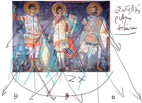 Τρεις στρατιωτικοί άγιοι. Μονή Χελανδαρίου, Άγιον Όρος. Αρχές 14ου αι. Εξαίσιο δείγμα λειτουργικής γραφής τριών αγίων που στήνονται σε χιαστί άξονες ερρύθμως ως προς εαυτούς (εσωτερικός ρυθμός) και ως προς τους θεατές (εξωτερικός ρυθμός).