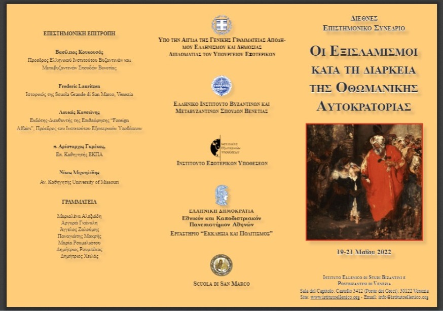 Διεθνές επιστημονικό συνέδριο με θέμα «Οι Εξισλαμισμοί κατά τη διάρκεια της Οθωμανικής Αυτοκρατορίας», πραγματοποιήθηκε με μεγάλη επιτυχία, στις 19-21 Μαΐου 2022, στην αίθουσα εκδηλώσεων του Ελληνικού Ινστιτούτου Βυζαντινών και Μεταβυζαντινών Σπουδών Βενετίας, υπό την αιγίδα της Γενικής Γραμματείας Απόδημου Ελληνισμού και Δημόσιας Διπλωματίας του Υπουργείου Εξωτερικών.