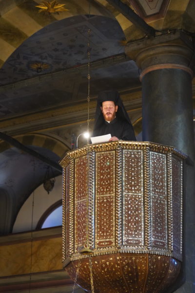 Το θείο λόγο κήρυξε ο Πανοσιολ. κ. Αλέξανδρος, τον οποίο μετά την Απόλυση χειροθέτησε σε Μ. Αρχιδιάκονο της Αγίας του Χριστού Μεγάλης Εκκλησίας.