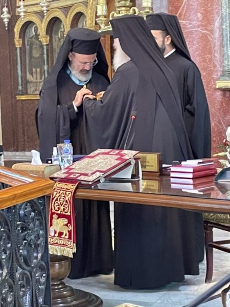 Ακολούθησε η περικόσμηση του Σεβασμιωτάτου Μητροπολίτου Πηλουσίου κ. Ναρκίσσου Πατριαρχικού Επιτρόπου Αλεξανδρείας από τον Μακαριώτατο με την τιμητική διάκριση του Ανωτέρου Ταξιάρχη του Αγίου Μάρκου, επί τη συμπληρώσει δεκαετούς ευόρκου αρχιερατείας.