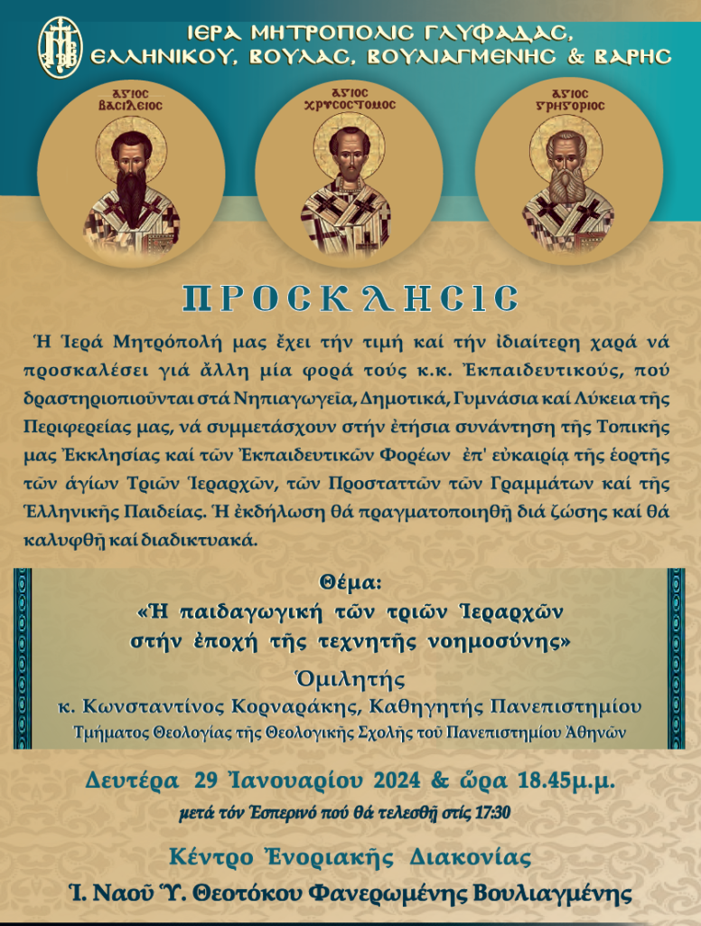 Θέμα της εκδήλωσης είναι «Η παιδαγωγική των Τριών Ιεραρχών στην εποχή της τεχνητής νοημοσύνης».