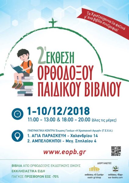 Η Έκθεση Ορθοδόξου Παιδικού Βιβλίου διοργανώνεται για 2η συνεχόμενη χρονιά στην Αθήνα! Στην Αγία Παρασκευή Αττικής (Χαλανδρίου 14) και στους Αμπελοκήπους (Μεγάλου Σπηλαίου 4) από 1 έως 10 Δεκεμβρίου 2018, οι Εκδόσεις «Ο Σωτήρ» και «Έαρ» φέρνουν κοντά σας βιβλία από πολλούς Ορθόδοξους εκδοτικούς οίκους, κατάλληλα για όλες τις παδικές και εφηβικές ηλικίες.