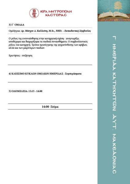 Η ημερίδα (πλην των κατηχητών) θα είναι ανοιχτή και σε περιορισμένο (λόγω covid) αριθμό Εκπαιδευτικών Α’/θμιας και Β’/θμιας Εκπαίδευσης.