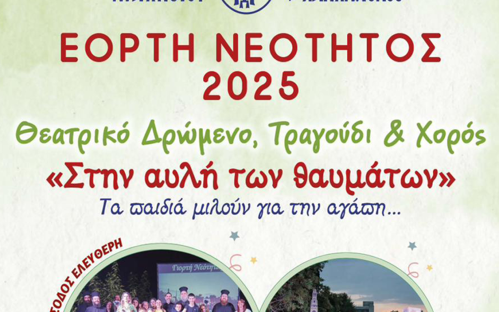 Οι νέες και οι νέοι από τις ενοριακές συντροφιές της Ιεράς Μητροπόλεως Νέας Ιωνίας, Φιλαδελφείας, Ηρακλείου και Χαλκηδόνος, διοργανώνουν την Κυριακή 15 Ιουνίου και ώρα 8:00μ.μ., στον πεζόδρομο της Πατριάρχου Ιωακείμ, έξω από τον Ιερό Ναό Αγίου Γεωργίου Νέας Ιωνίας, νεανική εορτή με τίτλο: