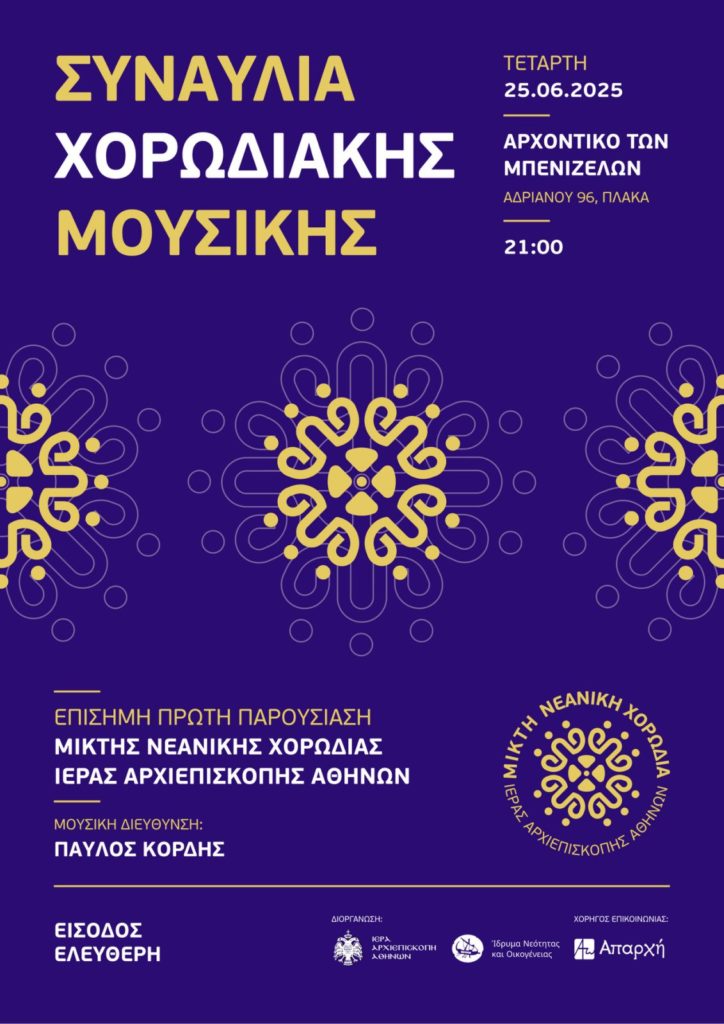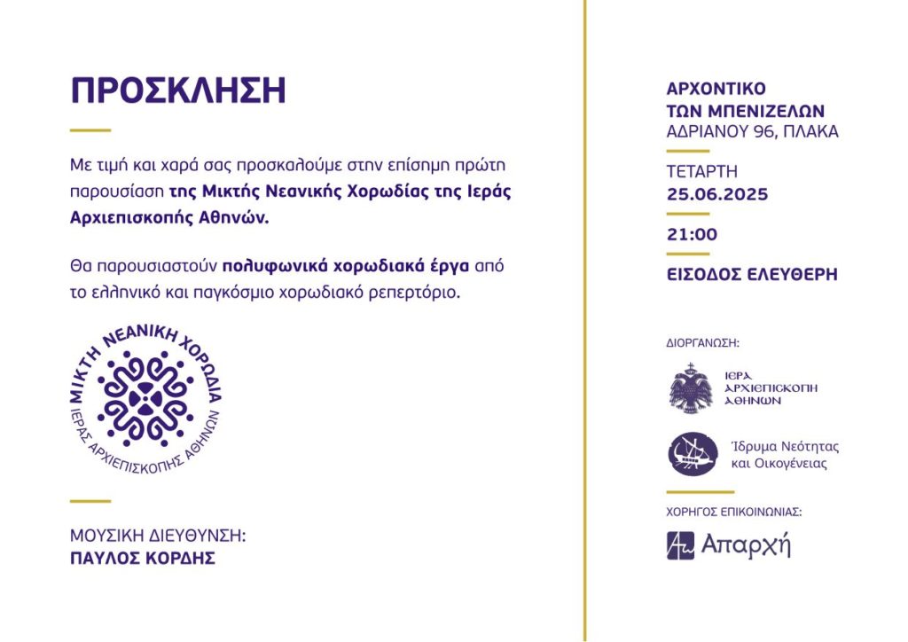 Η επίσημη πρώτη παρουσίαση της Μικτής Νεανικής Χορωδίας της Ιεράς Αρχιεπισκοπής Αθηνών θα πραγματοποιηθεί την Τετάρτη 25 Ιουνίου, στις 21:00 στο Αρχοντικό των Μπενιζέλων (Αδριανού 96, Πλάκα) με ελεύθερη είσοδο.