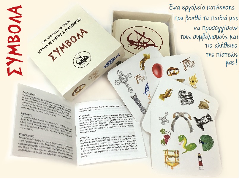 ΚΥΚΛΟΦΟΡΙΑ τοῦ νέου ἐπιτραπέζιου παιχνιδιοῦ μέ κάρτες, ὑπό τήν ὀνομασία «ΣΥΜΒΟΛΑ», πού μέ τίς εὐλογίες τοῦ Μακαριωτάτου Ἀρχιεπισκόπου κ.κ. Ἱερωνύμου Β΄ ἐπιμελήθηκε ὁ Πρωτ. π. Δημήτριος Παλιούρας (ἐφημέριος Ἱ. Ναοῦ Ἁγίων Πάντων Καλλιθέας) σέ συνεργασία μέ τό Ἵδρυμα Νεότητος καί Οἰκογένειας τῆς Ἱερᾶς Ἀρχιεπισκοπῆς Ἀθηνῶν.