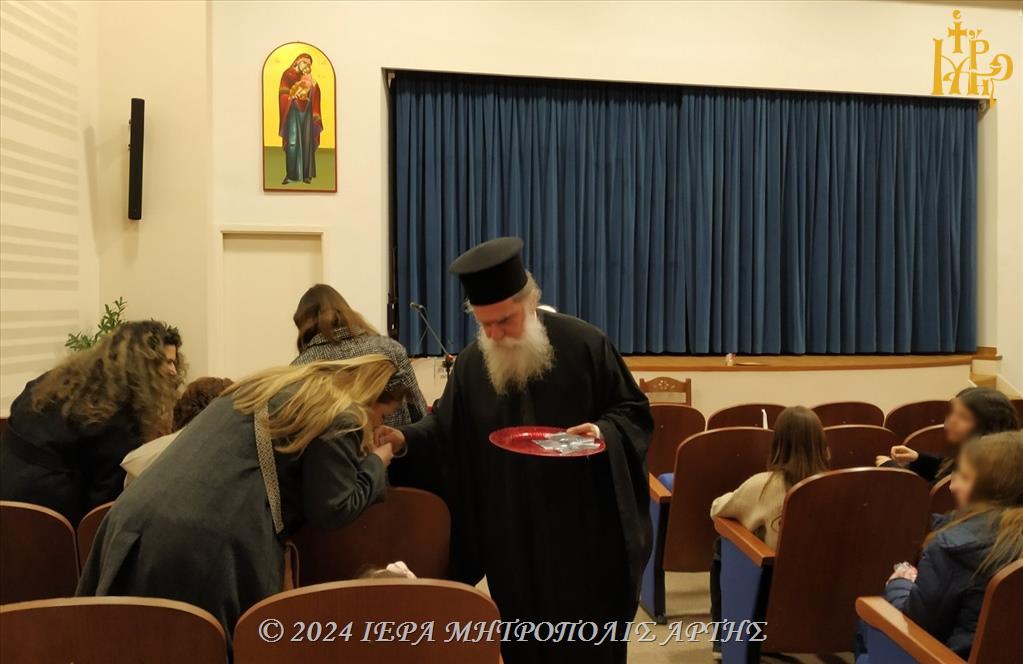 Λίγο αργότερα, ευλόγησε την Βασιλόπιτα και ομίλησε στους μαθητές του Κατηχητικού αρρένων της Ιεράς Μητροπόλεως Άρτης.
