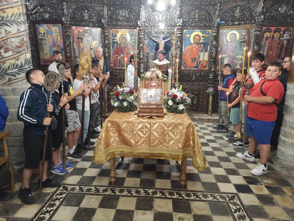 Η Ιερή Ακολουθία περιέλαβε και την προσκύνηση του αποτμήματος του ιερού λειψάνου του Αγίου Νικολάου του εν Βουναίνη, ο οποίος είναι προστάτης των νέων της Μητροπόλεως.