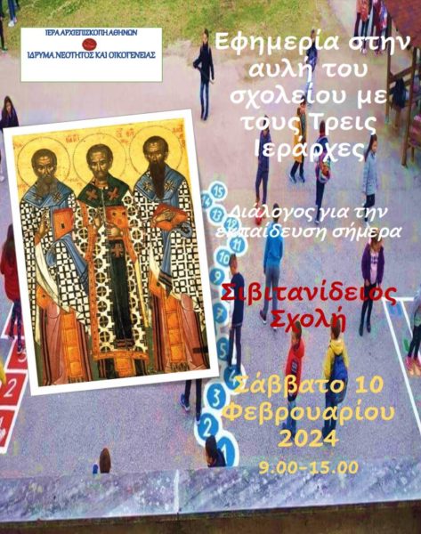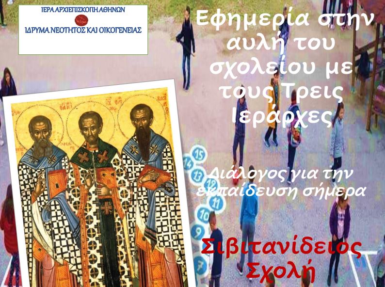 Το Ίδρυμα Νεότητος και Οικογένειας της Ι.Αρχιεπισκοπής Αθηνών με αφορμή την εορτή των Τριών Ιεραρχών διοργανώνει ημερίδα με θέμα «Εφημερία στην αυλή του σχολείου με τους Τρεις Ιεράρχες». Η αυλή του σχολείου είναι ένας σύνθετος χώρος. Αυτό φαίνεται ιδιαίτερα κατά την διάρκεια των διαλειμμάτων. Οι μαθητές και οι μαθήτριες φαίνεται να απολαμβάνουν την δεκάλεπτη ανάπαυλα, ενώ οι εκπαιδευτικοί, φαίνεται να επιβλέπουν.