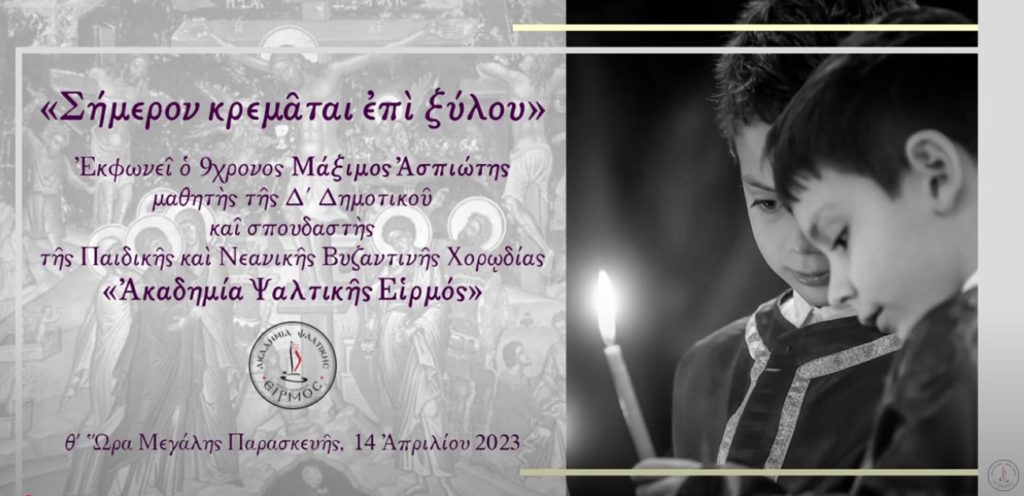 «Σήμερον κρεμάται επί ξύλου», κανονάρχημα του Δοξαστικού της 9ης Ώρας της Μεγάλης Παρασκευής. Εκφωνεί ο 9χρονος Μάξιμος Ασπιώτης, μαθητής Δ΄ Δημοτικού και σπουδαστής της Ακαδημίας Ψαλτικής Ειρμός, στο Κέντρο Λειτουργικής Κατηχήσεως και Ζωής της Ι.Μ.Λαγκαδά [Ιερός Ναός των Θεοφανείων].