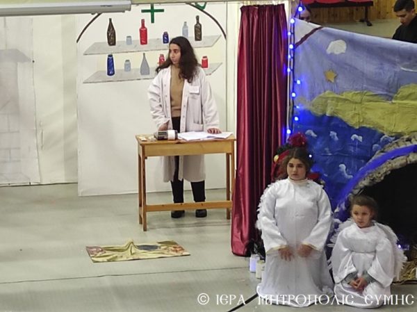 Το πρώτο μέρος, περιελάμβανε Χριστουγεννιάτικα ποιήματα και ακολούθησε η θεατρική παράσταση «Η Φαρμακοποιός Αστραδενή», που παρουσίασε η θεατρική ομάδα των παιδιών της Ενορίας Αγίου Ελευθερίου, την επιμέλεια της οποίας είχε η Διακόνισσα και Κατηχήτρια κ. Αργυρώ Κυπριώτη. Στο τέλος όλα τα παιδιά κατέβηκαν στη σκηνή και έψαλαν τα κάλαντα, σκορπίζοντας με τις φωνές τους χαρά και ζωντάνια.