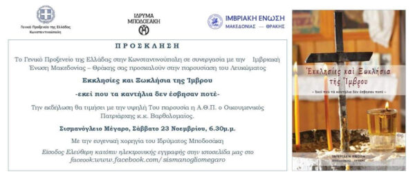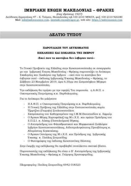 Το Γενικό Προξενείο της Ελλάδος στην Κωνσταντινούπολη σε συνεργασία με την Ιμβριακή Ένωση Μακεδονίας – Θράκης, συνδιοργάνωσαν την παρουσίαση του Λευκώματος “Εκκλησίες και Ξωκλήσια της Ίμβρου – εκεί που τα καντήλια δεν έσβησαν ποτέ”. Την εκδήλωση ετίμησε με την παρουσία του, ο Παναγιώτατος Οικουμενικός Πατριάρχης, κ.κ. Βαρθολομαίος, κατά το Σάββατο 23 Νοεμβρίου 2019 και ώρα 6.30 της εσπέρας στο Σισμανόγλειο Μέγαρο.