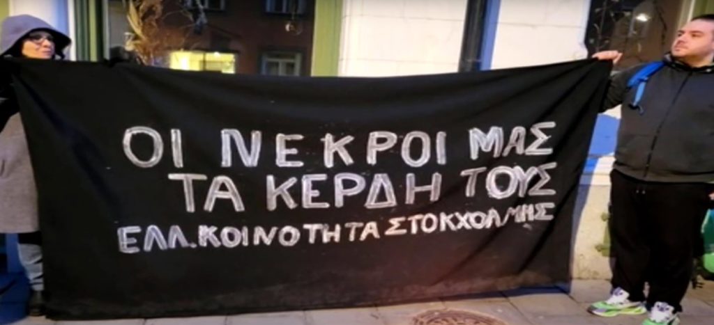 «Οι νεκροί μας τα κέρδη τους» έγραψαν σε μαύρα πανό τα μέλη της Ελληνικής Κοινότητας Στοκχόλμης, που χθες στις 18.00 το απόγευμα απαίτησαν έξω απ’ την ελληνική Πρεσβεία στη Σουηδία, δικαίωση. Η απόφαση για την κινητοποίηση πάρθηκε μια μέρα νωρίτερα στο περιθώριο των αρχιερεσιών για την ανάδειξη νέου προεδρείου. Εκεί, το σώμα εξέδωσε ανακοίνωση που μεταξύ άλλων αναφέρει: «Η απόδοση των ευθυνών θα έχει νόημα αν αποδοθούν στους, υψηλά ιστάμενους, πραγματικούς ενόχους και δεν περιορισθούν σε τυχόν ανθρώπινο λάθος κάποιου σταθμάρχη ή κλειδούχου. Θα έχει νόημα αν οδηγήσουν σε ασφαλείς μαζικές μεταφορές όχι μόνο των σιδηροδρόμων αλλά και όλων των άλλων μέσων μαζικής μεταφοράς. Θα υπάρξει μια τέτοια απόδοση ευθυνών;»