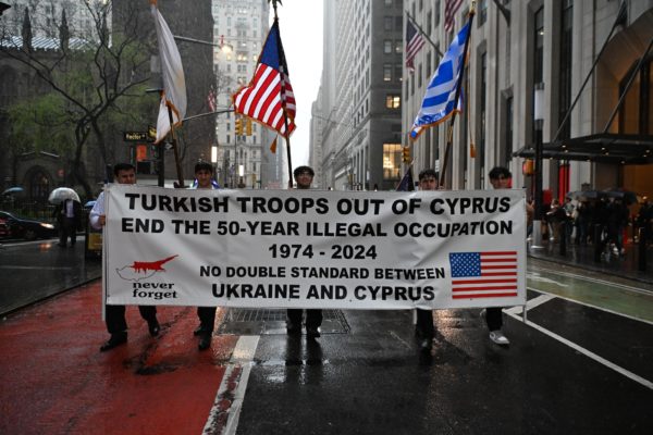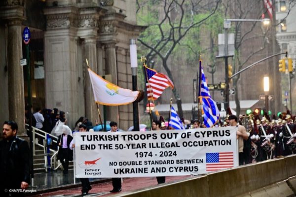 Μετά το πέρας της Δοξολογίας ξεκίνησε η παρέλαση με προπομπούς τους σημαιοφόρους και το πανό της Ομοσπονδίας Κυπριακών Οργανώσεων Αμερικής, το οποίο έκανε λόγo για τα δύο μέτρα και δύο σταθμά που τηρεί η διεθνής κοινότητα σε σχέση με την εισβολή και την 50ετή κατοχή της Τουρκίας στην Κύπρο, και την εισβολή της Ρωσίας στην Ουκρανία.