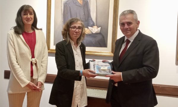 Ο Μάξιμος Χαρακόπουλος προσφέρει αναμνηστικά στο προεδρείο της Ελληνικής Κοινότητας Μοντεβιδέο.