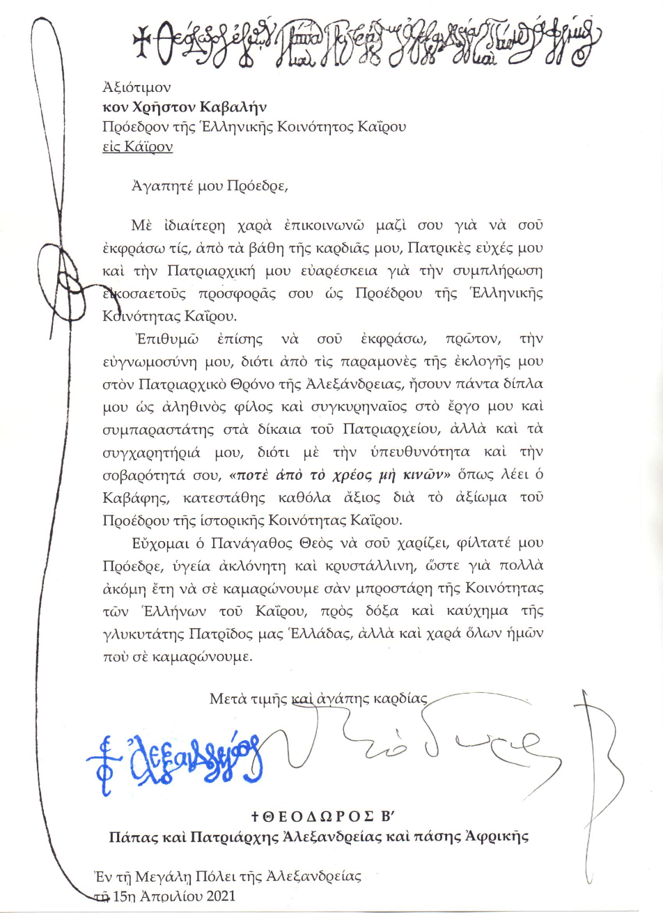 Τις εγκάρδιες ευχές του για τη συμπλήρωση 20 ετών στο πηδάλιο της Ελληνικής Κοινότητας Καΐρου, στέλνει ο Πάπας και Πατριάρχης Αλεξανδρείας και Πάσης Αφρικής κ.κ. Θεόδωρος Β, στον Χρήστο Καβαλή.