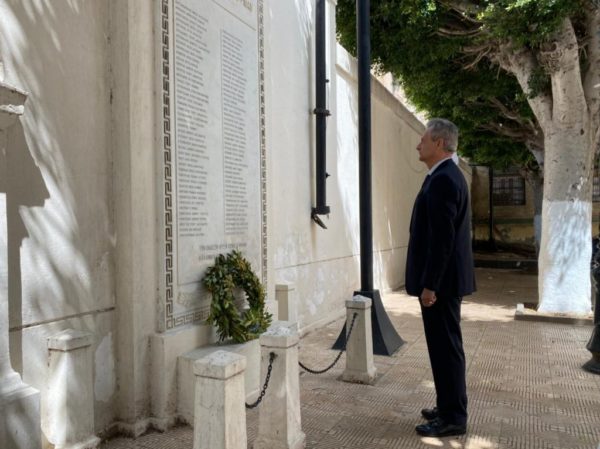 Στη συνέχεια εψάλη ο Εθνικός Ύμνος και ακολούθησε κατάθεση στεφάνων στο ηρώο, που βρίσκεται στον αυλόγηρο του Ι.Ν. Ευαγγελισμού, από τους κ.κ. Κοσιώνη και Σιόκα.