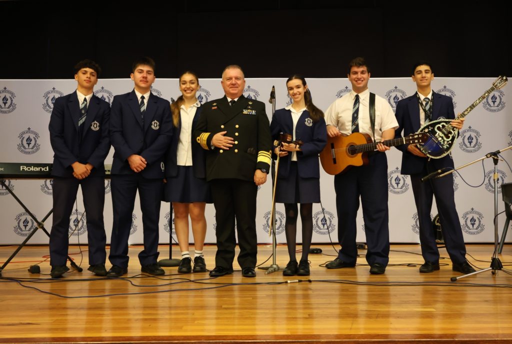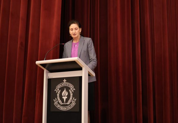 Η κ. Αιμιλία Κατσογιάννη, Διευθύντρια του Κολλεγίου, και ο κ. Ηλίας Οικονόμου, Πρόεδρος της Ενορίας και Πρόεδρος του Διοικητικού Συμβουλίου, καλωσόρισαν θερμά τον Αντιναύαρχο Θεόδωρο Μικρόπουλο ΠΝ, Υπαρχηγό ΓΕΕΘΑ, και τη σύζυγό του κ. Παγώνα Ζεϊμπέκη, τον Αντιπλοίαρχο Δημήτριο Λεκκάκο ΠΝ, τον Ακόλουθο Άμυνας της Ελλάδας στην Αυστραλία, Συνταγματάρχη ΠΒ Κυριάκο Κυριακάκο, τον Γενικό Πρόξενο της Ελλάδος στο Σύδνεϋ κ. Ιωάννη Μαλλικούρτη και τον κ. Ελευθέριο Σαβιολάκη, εκ της Κρητικής Αδελφότητος Σύδνεϋ και Νέας Νοτίου Ουαλίας.
