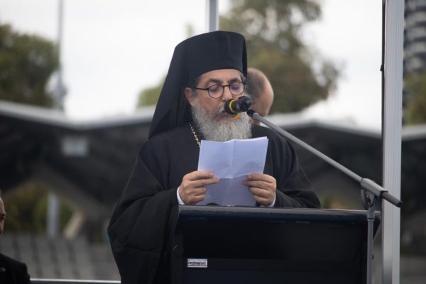 Τον Σεβασμιώτατο Αρχιεπίσκοπο Αυστραλίας κ. Μακάριο εκπροσώπησαν οι Θεοφιλέστατοι Επίσκοποι Σωζοπόλεως κ. Κυριακός και Κερασούντος κ. Ευμένιος, Αρχιεπισκοπικοί Επίτροποι Μελβούρνης και Northcote αντιστοίχως. Ο Θεοφιλέστατος κ. Κυριακός μετέφερε χαιρετισμό του Σεβασμιωτάτου, καθώς και την ευλογία του στο πλήθος των ομογενών.