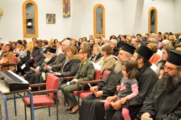 Στην κατάμεστη αίθουσα του Πνευματικού Κέντρου παρέστησαν επίσης κληρικοί της Ιεράς Μητροπόλεως και εκπρόσωποι των τοπικών αρχών και φορέων.