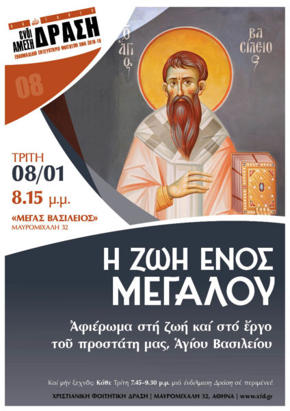 Κατά την Τρίτη 8 Ιανουαρίου 2019, στις 8.15 μ.μ., στο Εντευκτήριο των φοιτητών της Χριστιανικής Φοιτητικής Δράσης (Χ.Φ.Δ.) στον «Μέγα Βασίλειο» επί της οδού Μαυρομιχάλη 32 στην Αθήνα, θα λάβει χώρα αφιέρωμα στη ζωή και στο έργο του Αγίου Βασιλείου υπό τον γενικό τίτλο: “Η ΖΩΗ ΕΝΟΣ ΜΕΓΑΛΟΥ”.