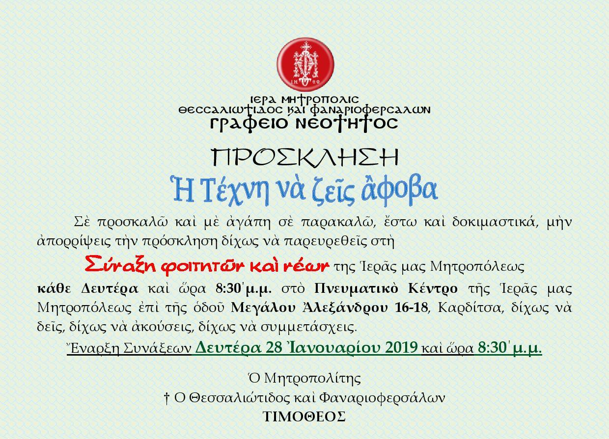 Την Δευτέρα 28 Ιανουαρίου ξεκινούν οι Συνάξεις νέων στην Ιερά Μητρόπολη Θεσσαλιώτιδος και Φαναριοφερσάλων. Οι Συνάξεις θα πραγματοποιούνται κάθε Δευτέρα και ώρα 8:30 μ.μ στο Πνευματικό Κέντρο της Μητροπόλεως στην Καρδίτσα.