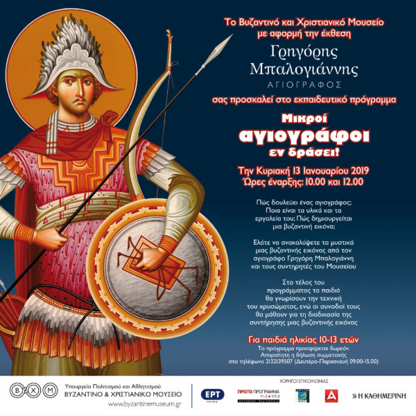 Εκπαιδευτικό πρόγραμμα με θέμα «Μικροί αγιογράφοι εν δράσει!» διοργανώνει το Βυζαντινό και Χριστιανικό Μουσείο, με αφορμή την έκθεση «Γρηγόρης Μπαλογιάννης, Αγιογράφος». Το πρόγραμμα θα πραγματοποιηθεί κατά την Κυριακή 13 Ιανουαρίου 2019 και ώρες 10:00 και 12:00.