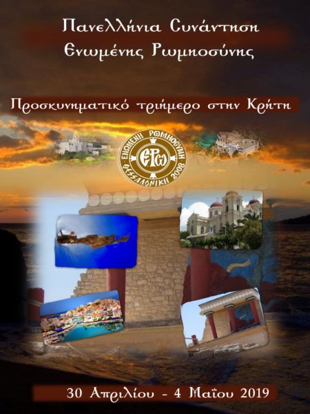 Ἡ ΕΝΩΜΕΝΗ ΡΩΜΗΟΣΥΝΗ διοργανώνει κατά τὴν διακαινήσιμο ἑβδομάδα καὶ συγκεκριμένα ἀπὸ τὶς 30 Ἀπριλίου ἕως καὶ τὶς 4 Μαΐου 2019 ἐκδρομικὸ προσκύνημα στὴν Κρήτη!