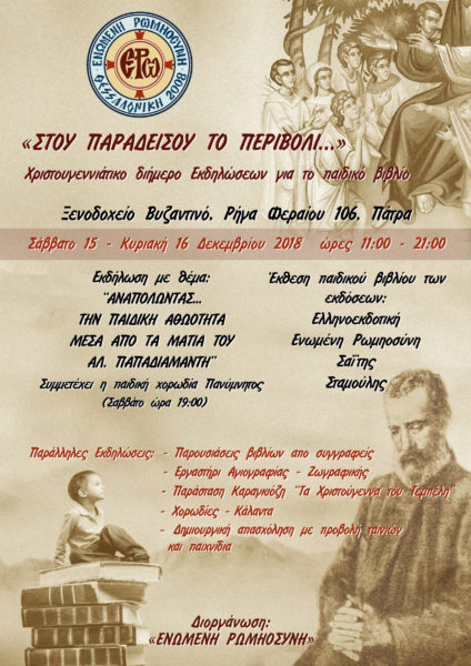 08/12/2018 08/12/2018 Tό Σωματεῖο ΕΝΩΜΕΝΗ ΡΩΜΗΟΣΥΝΗ διοργανώνει στήν Πάτρα τό διήμερο 15 καί 16 Δεκεμβρίου 2018 (Σάββατο – Κυριακή) Χριστουγεννιάτικο διήμερο ἐκδηλώσεων γιά τό παιδικό βιβλίο μέ θέμα: «ΣΤΟΥ ΠΑΡΑΔΕΙΣΟΥ ΤΟ ΠΕΡΙΒΟΛΙ». Ἡ ἐκδήλωση πού θά πραγματοποιηθεῖ στήν Αἴθουσα ἐκδηλώσεων τοῦ ξενοδοχείου ΒΥΖΑΝΤΙΝΟ (Ρήγα Φεραίου 106, Πάτρα) περιλαμβάνει, Ἔκθεση παιδικοῦ βιβλίου ἀπό ἐκδοτικούς οἴκους, προβολή παιδικῶν Χριστιανικῶν...