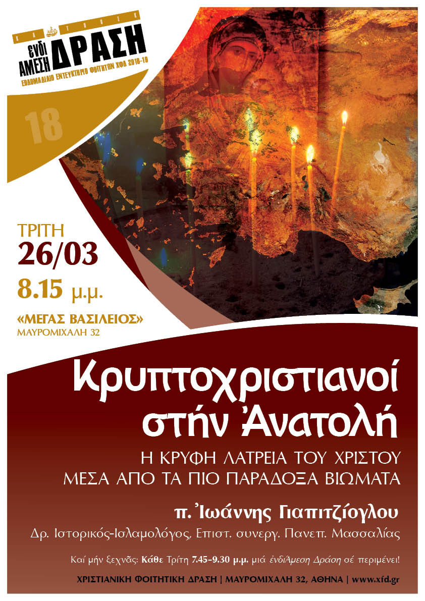 Αυτή την Τρίτη, 26 Μαρτίου 2019, στις 8:15 μ.μ., στο εντευκτήριο της Χριστιανικής Φοιτητικής Δράσης (Μαυρομιχάλη 32, 4ος όροφος, Αθήνα):