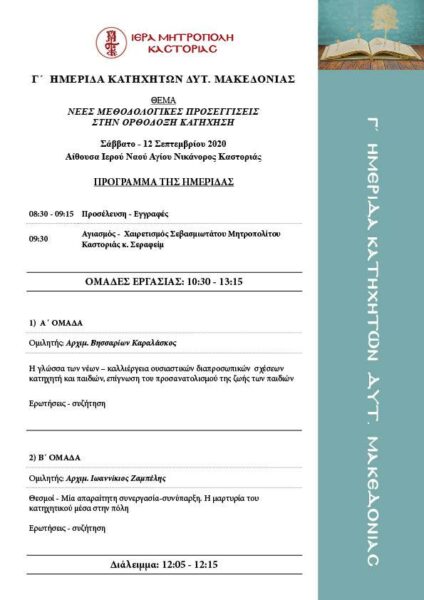 Ανοιχτή πρόσκληση στην Γ’ Ημερίδα Κατηχητών Δυτικής Μακεδονίας, με τίτλο, «Νέες Μεθοδολογικές Προσεγγίσεις στην Ορθόδοξη Κατήχηση», που θα πραγματοποιηθεί το ερχόμενο Σάββατο, 12 Σεπτεμβρίου 2020, απευθύνει η Ιερά Μητρόπολη Καστορίας.