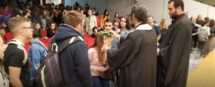 Στο ξεκίνημα της νέας χρονιάς οι φοιτητές του Αριστοτελείου Πανεπιστημίου Θεσσαλονίκης είχαμε την ευλογία και τις ευχές των πνευματικών μας πατέρων με την καθιερωμένη τελετή του Αγιασμού που διοργανώνεται για όλους τους φοιτητές και τους καθηγητές του Αριστοτελείου Πανεπιστημίου Θεσσαλονίκης. Όπως κάθε χρόνο, έτσι και φέτος η αίθουσα τελετών ήταν κατάμεστη από φοιτητές, αλλά και από τους σεβαστούς καθηγητές μας. Την τελετή έκλεισαν οι ευχές του π. Κωνσταντίνου, εκπροσώπου του Παναγιωτάτου Μητροπολίτη Θεσσαλονίκης κ.κ. Ανθίμου και του Πρύτανη κ. Ν. Παπαϊωάννου.