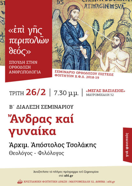 Την Τρίτη 26/2/2019, 7.30 μ.μ., στο Εντευκτήριο των φοιτητών της Χ.Φ.Δ. στον «Μέγα Βασίλειο», Μαυρομιχάλη 32 (4ος όροφος), η Β΄ Διάλεξη του Σεμιναρίου Ορθοδόξου Πίστεως “ΑΝΔΡΑΣ ΚΑΙ ΓΥΝΑΙΚΑ”. Ομιλητής: Αρχιμ. Απόστολος Τσολάκης, Θεολόγος – Φιλόλογος.