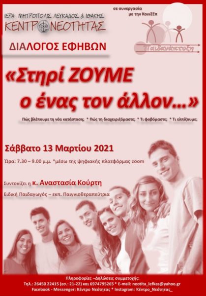 13/03/2021 13/03/2021 Ολοκληρώθηκε η πρώτη διαδικτυακή δράση της Ιεράς Μητροπόλεως Λευκάδος και Ιθάκης, που απευθύνεται σε εφήβους και μαθητές γυμνασίου και λυκείου, με θέμα:  «Στηρίζουμε ο ένας τον άλλον» και αφορμή την κατάσταση που έχει δημιουργηθεί εδώ και ένα χρόνο εξαιτίας του κορωνοϊού. Μικροί και μεγάλοι βιώνουν δύσκολες καταστάσεις τον τελευταίο καιρό ως απόρροια της πανδημίας. Η...