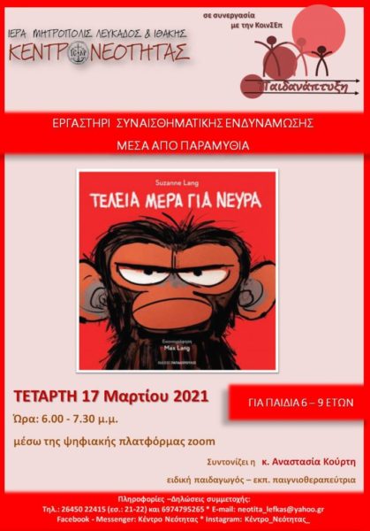 Το δεύτερο εργαστήρι θα είναι «Συναισθηματικής Ενδυνάμωσης μέσα από παραμύθια» και θα λειτουργήσει για παιδιά 6 – 9 ετών την Τετάρτη  17 Μαρτίου 2021 και ώρα 6.00 – 7.30 μ.μ. Με αφορμές από το παραμύθι «Τέλεια μέρα για νεύρα» της LangSuzanne οι μικροί φίλοι θα έχουν την ευκαιρία να εκφράσουν τα συναισθήματά τους μέσα από εικαστικά παιχνίδια κ.ά. κατάλληλους για την ηλικία τους τρόπους.