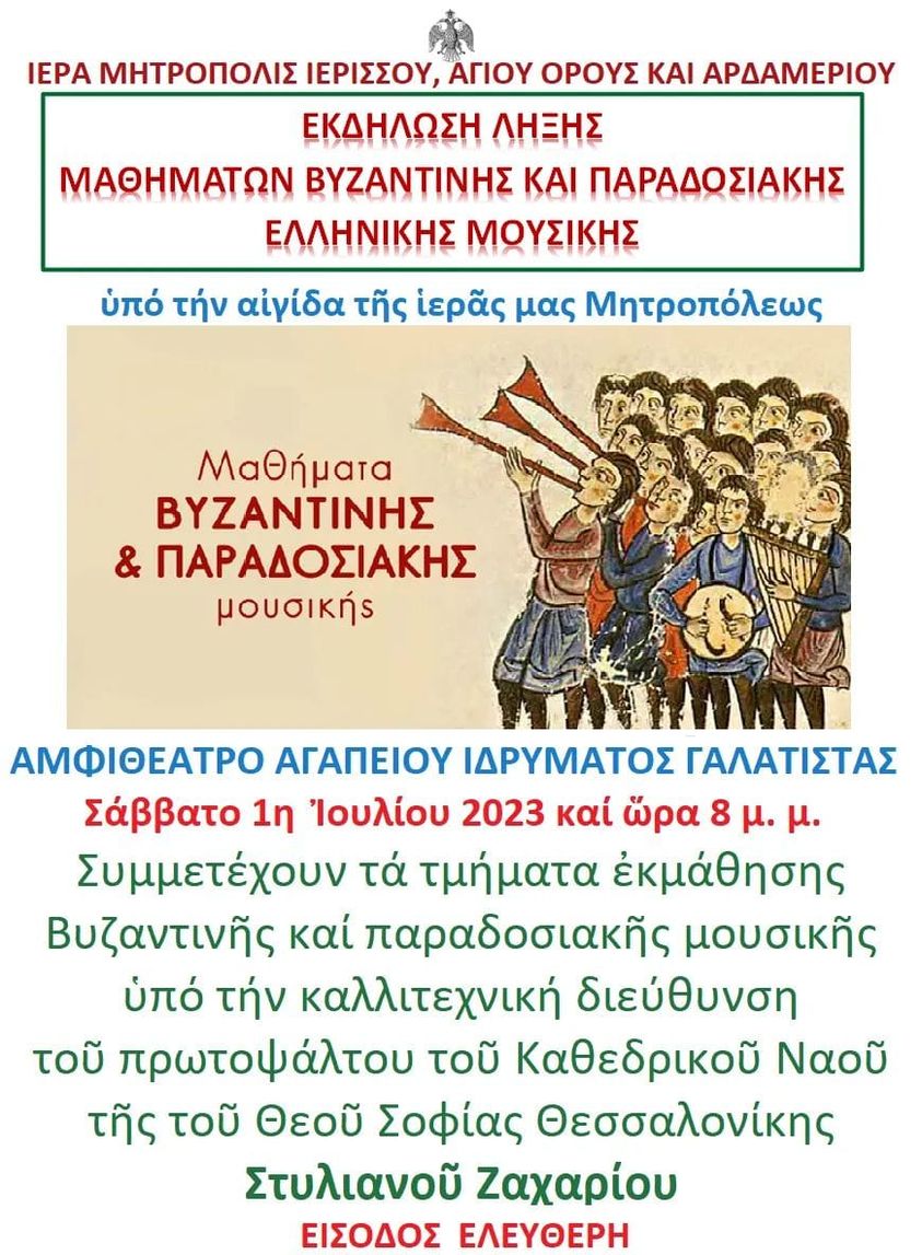 Εκδήλωση για την λήξη μαθημάτων βυζαντινής και παραδοσιακής ελληνικής μουσικής θα πραγματοποιηθεί το Σάββατο 1η Ιουλίου, στις 20:00, στο αμφιθέατρο Αγάπειου Ιδρύματος Γαλατίστας. Η εκδήλωση τελεί υπό την αιγίδα της Ιεράς Μητρόπολης Ιερισσού.