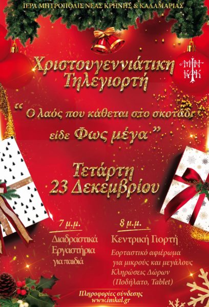 Με ιδιαίτερη χαρά και τιμή η Ιερά Μητρόπολη Νέας Κρήνης και Καλαμαριάς προσκαλεί μικρούς και μεγάλους στη Xριστουγεννιάτικη Tηλεγιορτή με τίτλο: «Ο λαός που κάθεται στο σκοτάδι είδε Φως μέγα». Η εκδήλωση πραγματοποιείται με τις ευλογίες του Σεβασμιωτάτου Μητροπολίτη κ. Ιουστίνου, την Τετάρτη 23 Δεκεμβρίου 2020, σε ζωντανή, διαδικτυακή σύνδεση.