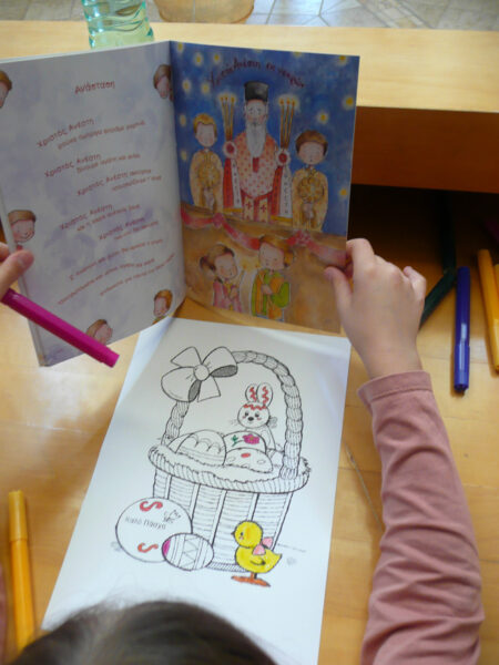 Τέλος, οι μικροί αναγνώστες, αφού ζωγράφισαν πασχαλινές ζωγραφιές για να κοσμούν τα δωμάτιά τους, αντάλλαξαν ευχές για το Πάσχα.