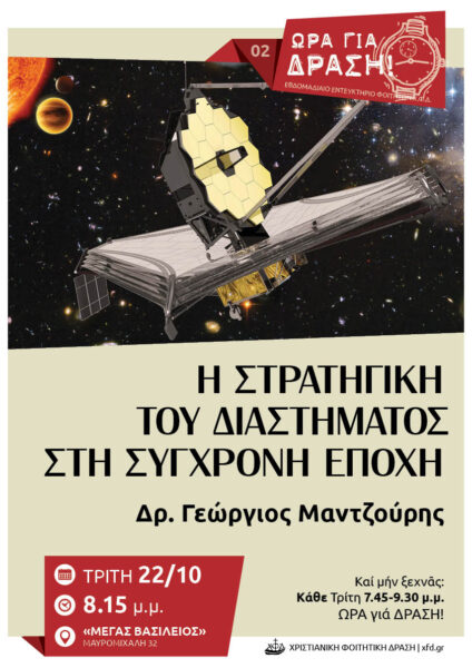 Την Τρίτη 22/10, 8.15 μ.μ., μία ξεχωριστή ομιλία στο Εντευκτήριο των φοιτητών της Χριστιανικής Φοιτητικής Δράσης Αθηνών στον «Μέγα Βασίλειο» (Μαυρομιχάλη 32): “Η στρατηγική του διαστήματος στη σύγχρονη εποχή”. Ομιλητής θα είναι ο Δρ. Γεώργιος Μαντζούρης.